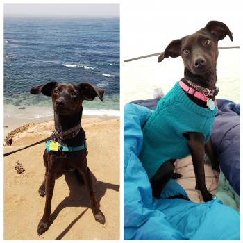 We received this sweet "pupdate" about Noodle (fka Daffy) from her adoptive family. Noodle was adopted from us in February 2020. Seeing her enjoying her time at the beach and wearing an adorable sweater, just made our day!
