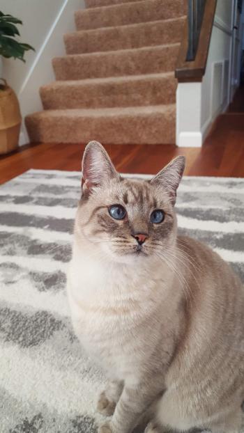 "Barbie Mom has been renamed to Elsie. She loves to spend her time sunbathing and chasing her favorite toy, a shiny red string. Other favorite toys are ping pong balls, packing paper and toilet paper rolls. She loves company and will find the perfect perch so you are always within her sight. In the mornings, a good massage of ruffling her fur will elicit happy purrs. Watch out for laying on the floor because Elsie's favorite thing is to cuddle your head, get tangled in your hair, then fall fast asleep leaving you trapped on the floor. Oddly Elsie dislikes deep handsome voices and the sound of the AC being on. While on the other hand she loves window watching, is friendly with female strangers, and is not afraid of the roomba. When we first got Elsie, she had just finished nursing her litter and undergone getting spayed. Now at a healthy 10 pounds, Elsie favors seafood flavors and never attempts to sneak at human food anymore. She quickly learned not to scratch the couch or be on the kitchen counter and is a very polite and smart kitty. We love Elsie and so thankful to have her in our lives."